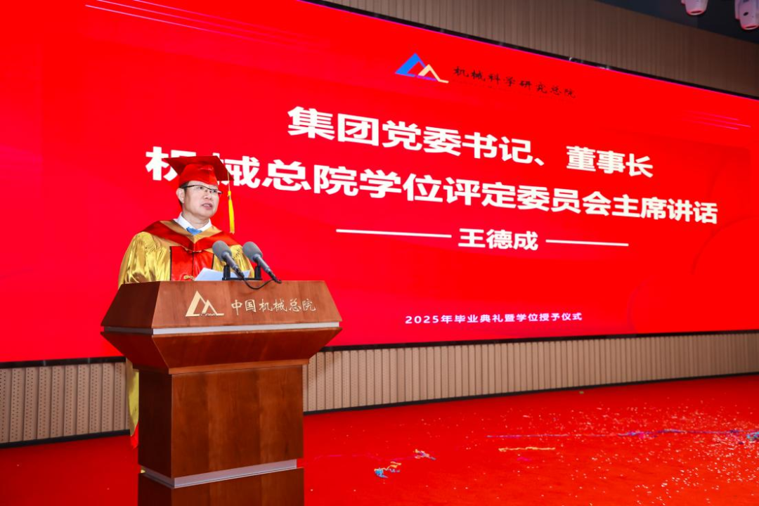 機(jī)械總院學(xué)位評(píng)定委員會(huì)主席、集團(tuán)黨委書(shū)記、董事長(zhǎng)王德成,集團(tuán)黨委副書(shū)記、總經(jīng)理孟祥宇,集團(tuán)黨委副書(shū)記、董事李玉鑫,集團(tuán)黨委委員、副總經(jīng)理王宇,機(jī)械總院學(xué)位評(píng)定委員會(huì)副主席、集團(tuán)副總經(jīng)理李?lèi)?ài)國(guó),集團(tuán)副總經(jīng)理姜超出席典禮,機(jī)械總院學(xué)位評(píng)定委員會(huì)委員、京內(nèi)外各二級(jí)單位領(lǐng)導(dǎo)、導(dǎo)師代表、研究生管理部門(mén)負(fù)責(zé)人、2025屆畢業(yè)生及家屬共計(jì)190余人齊聚一堂,共同見(jiàn)證這一重要時(shí)刻。典禮由機(jī)械總院學(xué)位評(píng)定委員會(huì)秘書(shū)長(zhǎng)、研究生院副院長(zhǎng)邊翊主持。